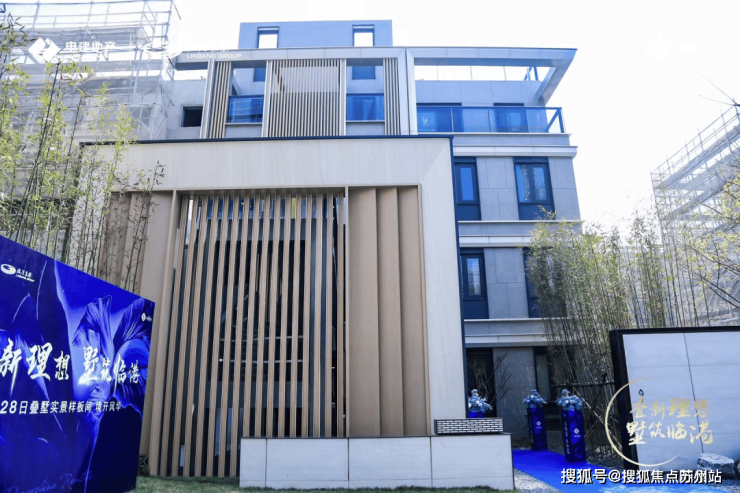 该楼盘目前在售 4 层宽境叠墅,主力面积 152-173㎡,单价 28500 元 /㎡起,具体一房一价。其建筑风格采用现代简约风格,小高层产品的立面采用灰色仿蓝钻真石漆搭配木纹铝板,每层腰线均由深灰色铝板及米白色仿白砂岩真石漆组成;叠加别墅立面采用了大量蓝钻石材以及香槟金铝板,搭配大面积落地玻璃。