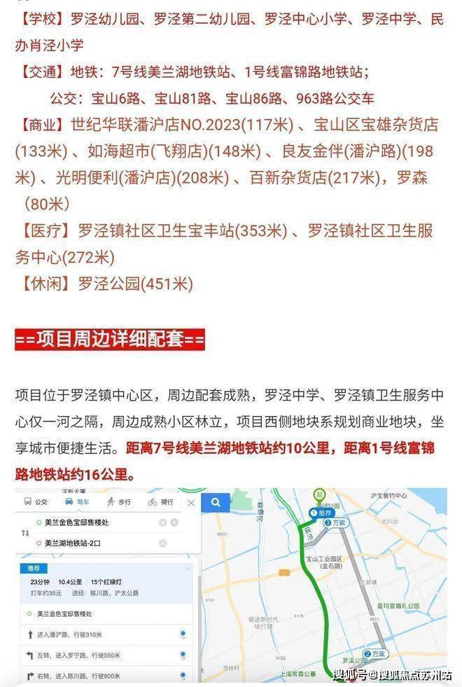 小区地处罗泾镇核心区,邻近115亩罗泾公园,周边配有罗泾中学、镇卫生服务中心及世纪华联超市等生活设施。交通方面可通过陈功路、沪太公路接驳市区,规划中的T1罗罗线中运量交通将衔接地铁7号线美兰湖站。项目所在区域属上海主城区2035规划范围,依托北郊未来产业园发展,周边正推进S7沪崇高速及沪太路快速化改造。美兰金色宝邸售楼处营销中心:400-8828-814美兰金色宝邸售楼处电话/地址☎:400-882-8814(开发商热线)