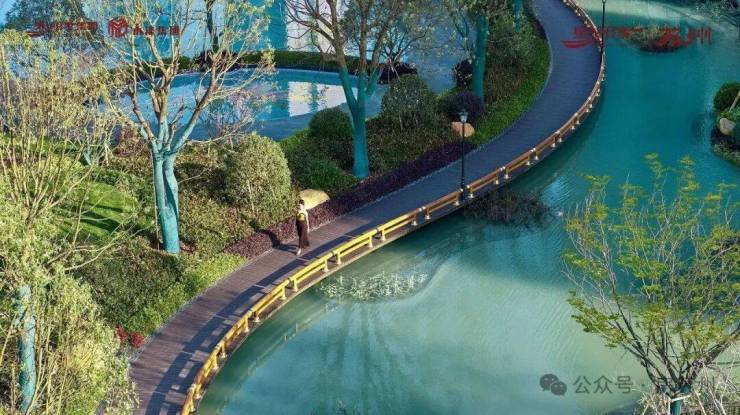 约2/3土地面积设计为水系园林,中央水景近8000㎡,四维景观体系,融合水景、奇石、名贵花木,以现代手法转译“小桥流水人家”的姑苏画境。