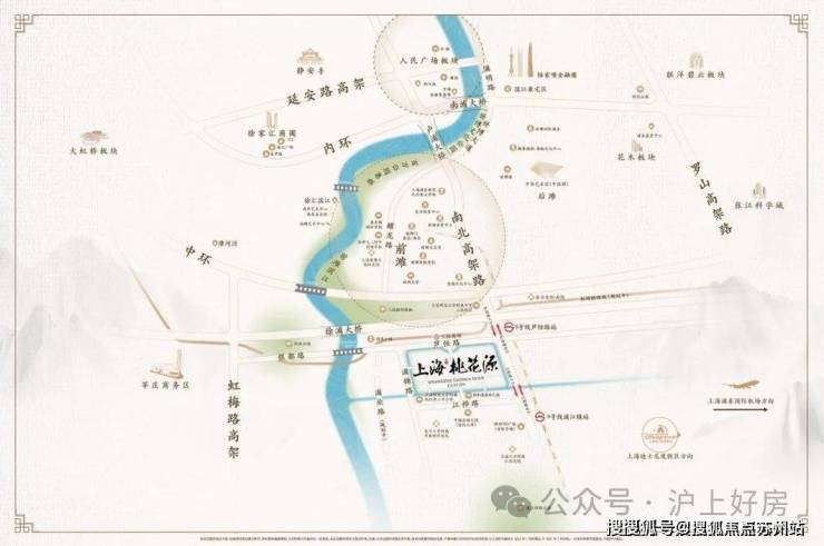 上海桃花源的择址,与传统市中心人民广场在南北中轴线上,由济阳路快速路、中环、外环以及各大隧桥快速连通市区,这是项目出则繁华的基础。
