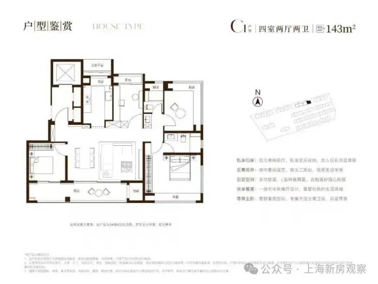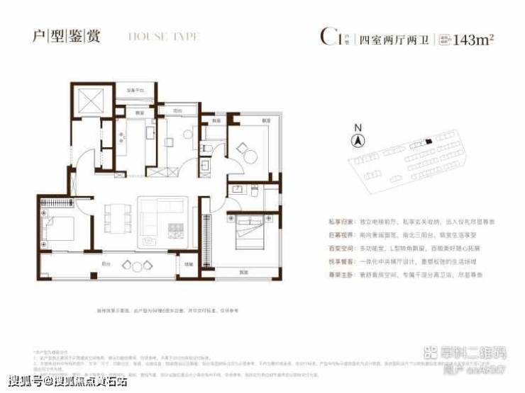 建筑面积约143㎡四房两厅两卫使用率约93%;