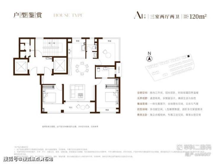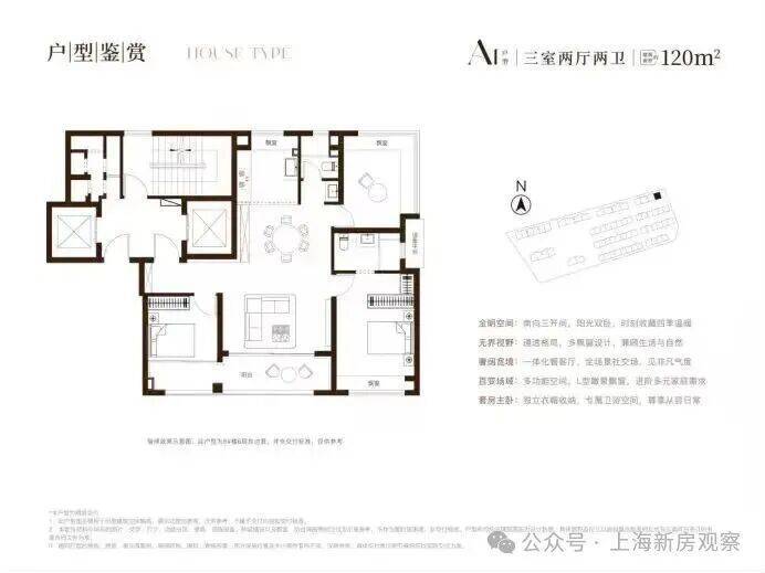 建筑面积约120㎡三房两厅两卫使用率约86%;