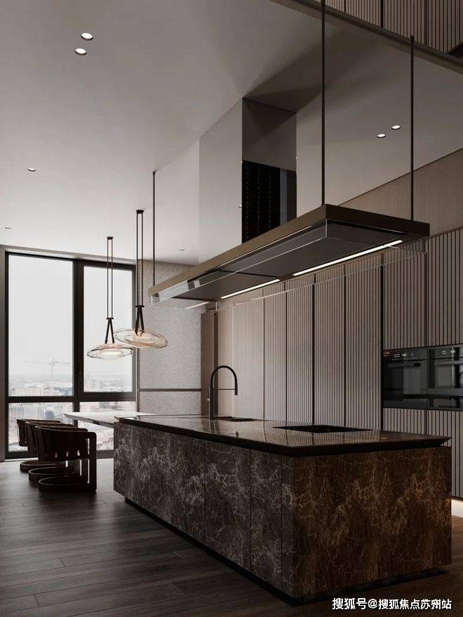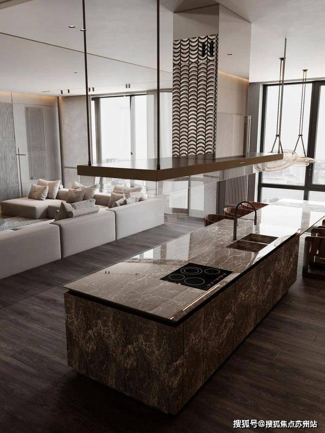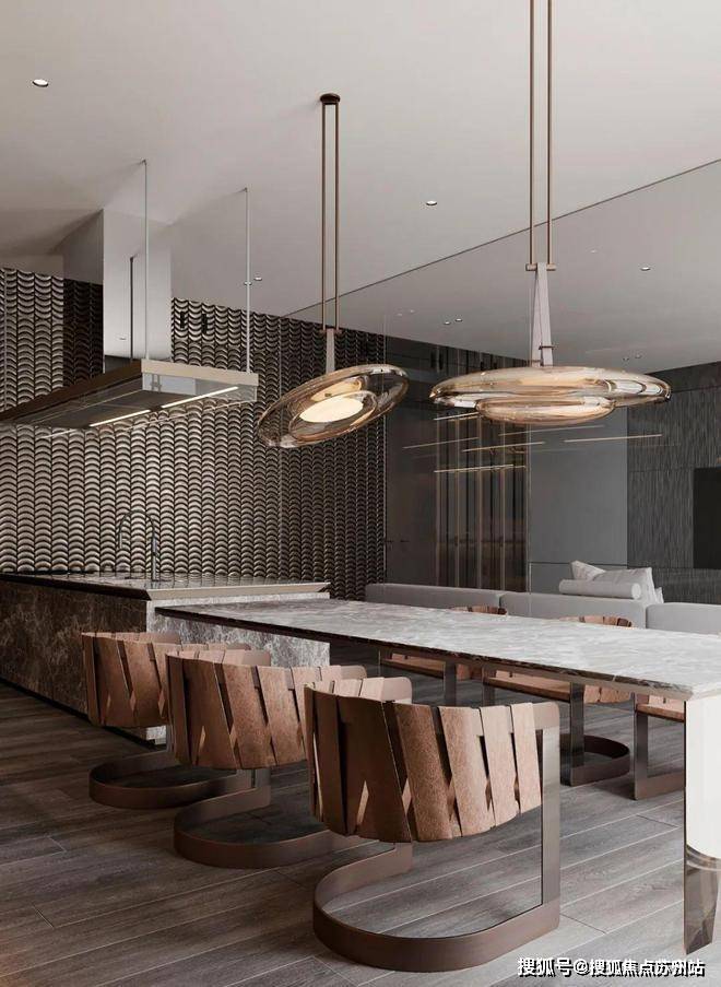 整个餐厅的墙壁和天花板全部使用可视镜作为装饰,把客厅和餐厅的风景全部融合在一起,餐厅的餐桌和大理石岛台完全烘托出现代的氛围感。圣和静安公馆售楼处电话:400-902-3966