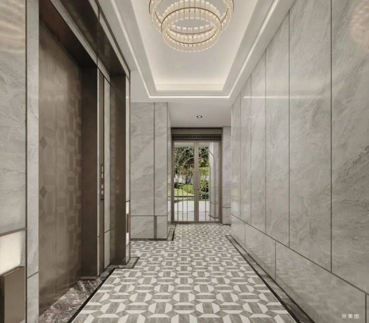 再次,项目首层大堂与电梯轿厢品质感拉满。