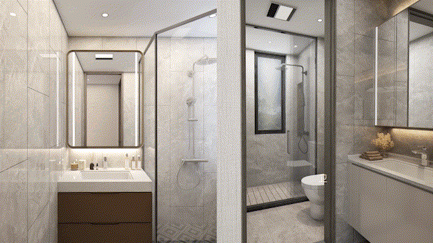 客卫做了经典的三段式的干湿分离的卫生间,采光也是毫不逊色,实用性极强。洗漱区做了储物镜柜,镜柜采用的是长拉链式且配带两条灯带,在延展视野方面,华润置地真的做到位了。