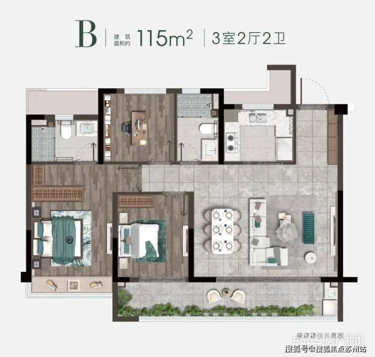 建面约115㎡,更是拥有近12米南向plus采光面,约8.6米双联大阳台连通餐客大横厅和次卧,超广角采光揽景,一抬眼,四季风景宛若悬挂在窗前的高清大片,每一帧都如入画境。