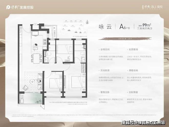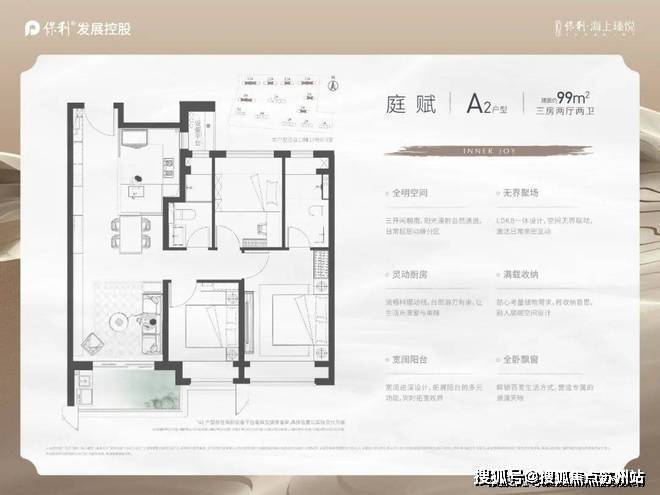 建筑面积约99㎡ 3房2厅2卫的户型十分优秀!全明空间+全卧飘窗+灵动厨房+宽阔阳台的设计也是细节满满!