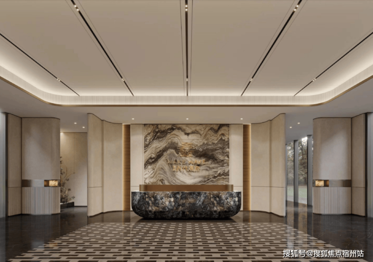 酒店式社区入口,设环岛落客区,高定入户大堂,设飘顶弧形雨棚,顶部采用香槟金色的斜角造型铝板,搭配手工打磨的星空顶及氛围灯,地面铺设仿石砖,墙面基调则借鉴了华尔道夫酒店的浅米黄色系大理石,并配以精致的礼仪灯设计。