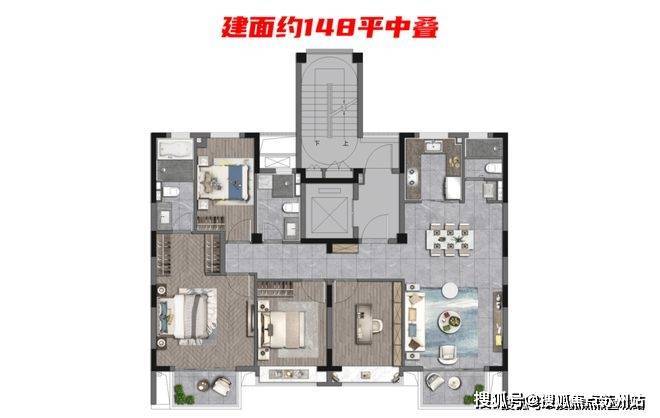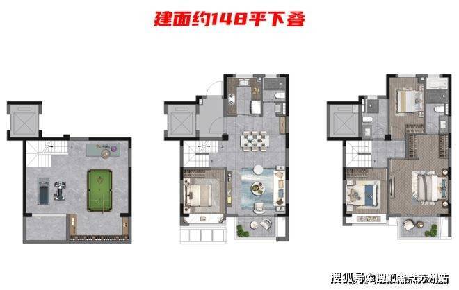 除此之外,项目还有约135平3房2厅3卫上叠、约148平4房2厅3卫中叠以及约148平4房2厅3卫下叠。