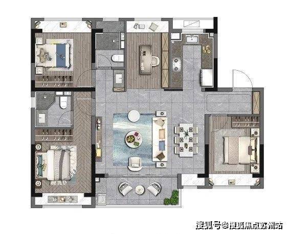 宽境4房,餐客厅一体横厅,大开间、进深短,飞机户型私密性更好,进阶/二孩家庭都能一步到位。