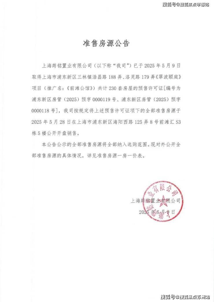 1.本项目备案名为“翠波颐庭”,推广名为“前滩公馆”;开发商为“上海筠铭置业有限公司”;预售证号:浦东新区房管(2025)预字0000118号(洛灵路179弄)、浦东新区房管(2025)预字0000119号(浩昌路188弄)。