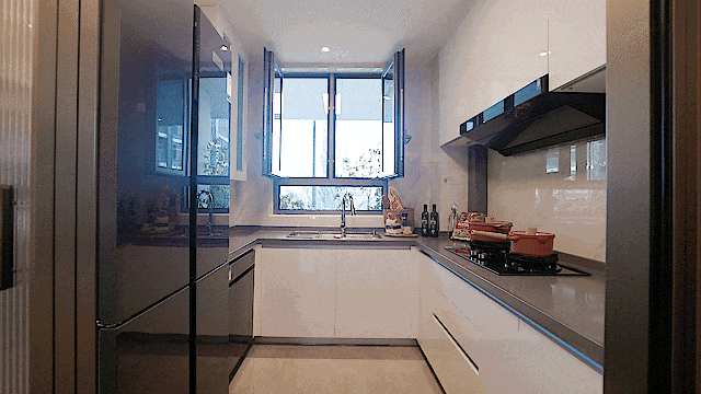 The stove is made of three sets of Fang Tai (or equivalent brand), the sink is Kohler (or equivalent brand), and it is equipped with a sliding door on the track to block the oil smoke.