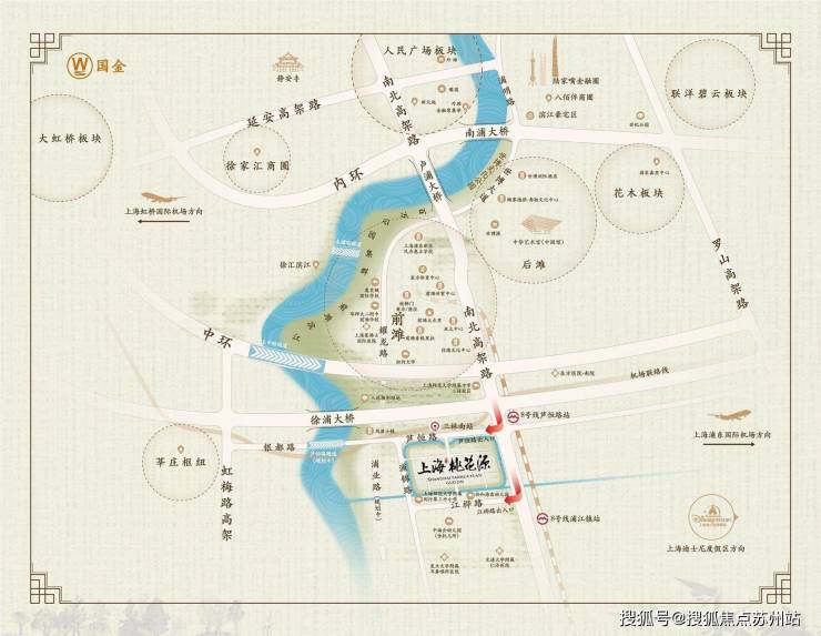 上海桃花源的择址,与传统市中心人民广场在南北中轴线上,由济阳路快速路、中环、外环以及各大隧桥快速连通市区,这是项目出则繁华的基础。