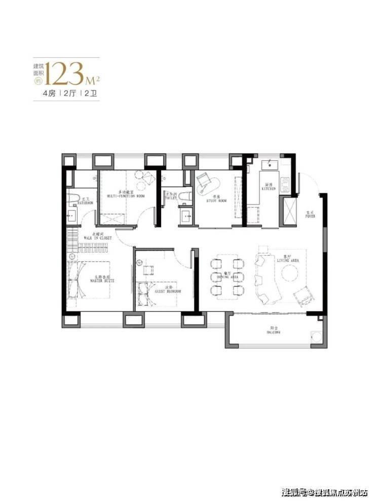 产品:103㎡、107㎡的三房两厅两卫及123㎡、129㎡的四房两厅两卫。