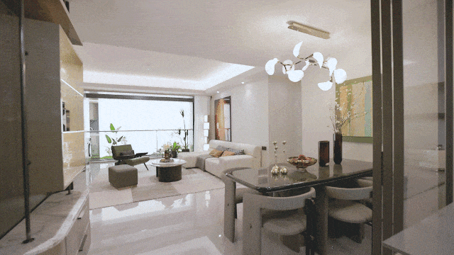 三开间朝南的方正格局,整个空间布局采用一体化设计,将客厅、餐厅、厨房、阳台各功能空间尺度放大,更大化的复合利用。