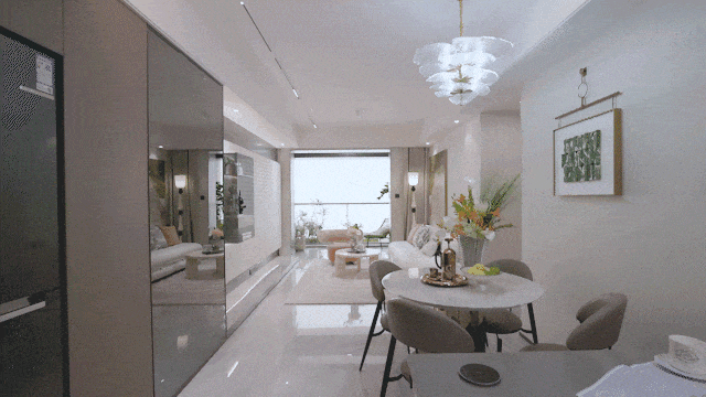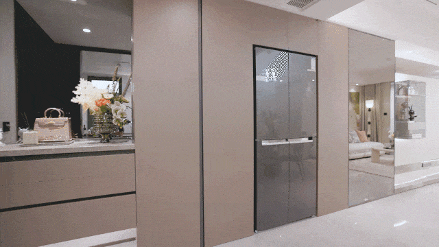 如果觉得户型图没办法将空间概念展现出来,大家也可以看一下样板房的实景图。采用大面积玄关柜结合S墙及灰镜,释放空间提高使用率。