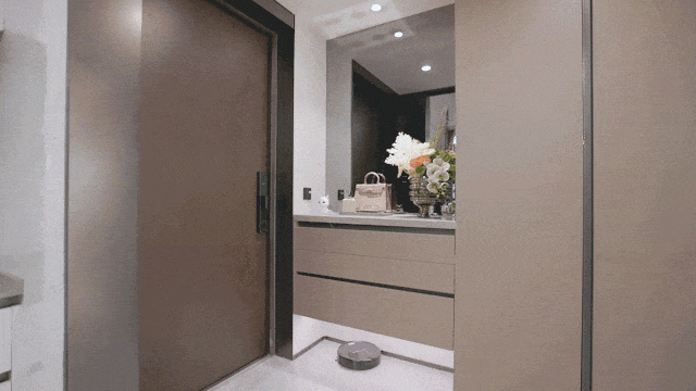 就连玄关柜内也做了隐藏细节,比如嵌入式鞋柜精灵,为女主人设计长筒靴位及折叠雨伞收纳区,下方更预留了扫地机器人的空间及电源。