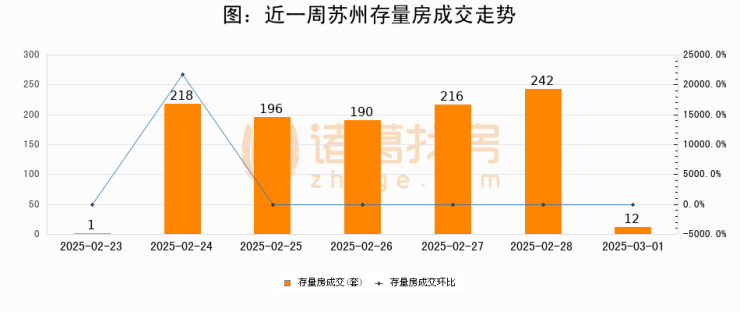 从存量房来看,2025年03月01日苏州存量房单日成交12套,比昨日减少230套,环比下降95%。从近一周存量房成交来看,苏州存量房日均成交套数为153套,03月01日单日成交12套,低于近一周平均水平92.2%。