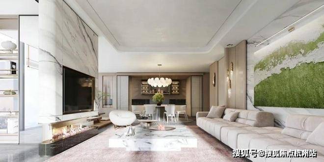 客厅采用艺术漆+实木贴面做装饰,天然石材做背景墙(仅235㎡户型为天然石材),地面采用岩板铺设,奢贵之感简直溢出屏幕!