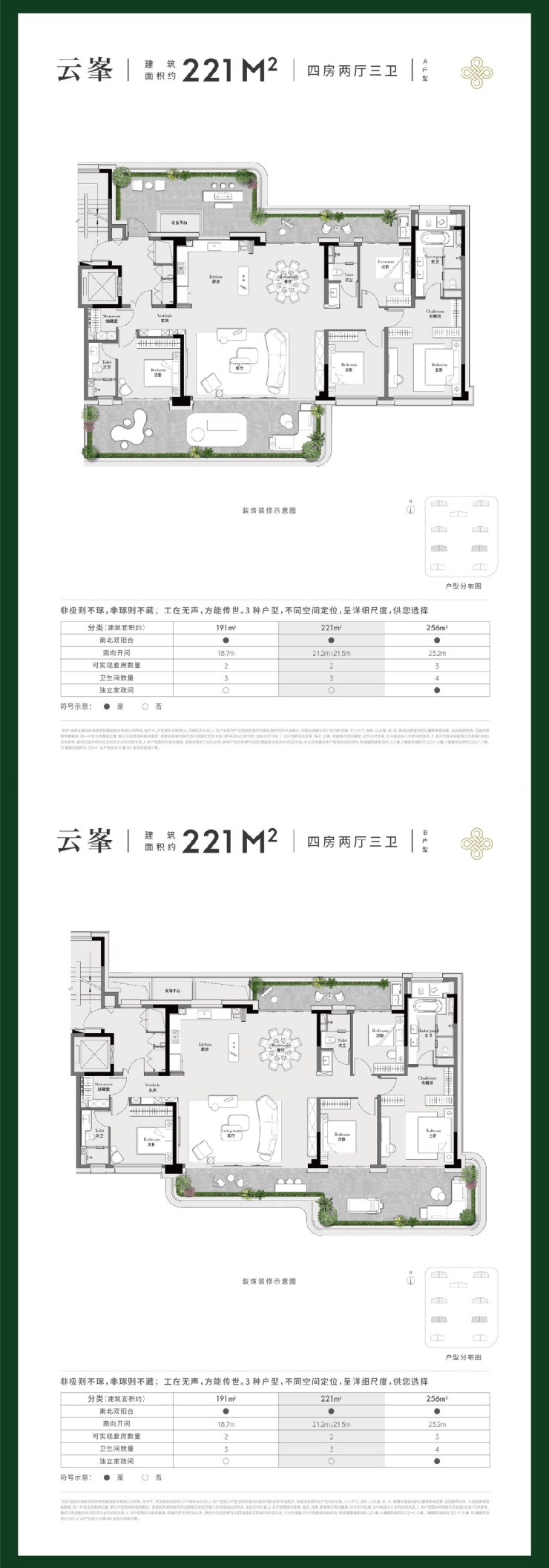 建筑面积约221㎡,4房2厅3卫(A、B户型)