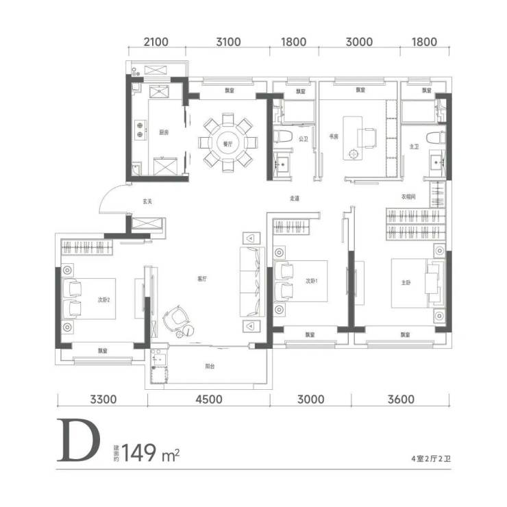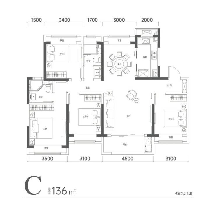 建面约136㎡客厅宽达4.5米,主卧宽3.5米,次房间分别达3.1米、3.4米,独立餐厅,靠窗南北通透。
