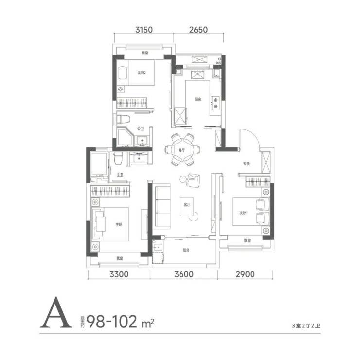 建面约100㎡是实打实3房,客厅宽度达3.6米,主房间宽达3.3米,连北面小房间也能放1.5米宽的床。