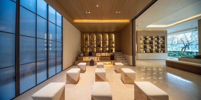 步入社区内部,“鎏光华堂、拾光艺廊、浮光水庭”三重空间依次呈现,层层递进的序列不仅营造出浓厚的归家礼序,更以充满艺术感的设计语言,将日常归家提升为一场心灵享受。