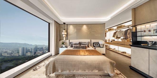 再看主卧空间,约40㎡的总统级套房设计,单论尺度便足够惊艳。配备三分离卫浴系统,洗漱、沐浴、如厕功能分区明确,互不干扰;独立衣帽间布局规整,可轻松收纳四季衣物,让收纳更具秩序感。此外,主卧南向搭载3.2米全景落地窗,通透采光与舒适体验双双拉满。