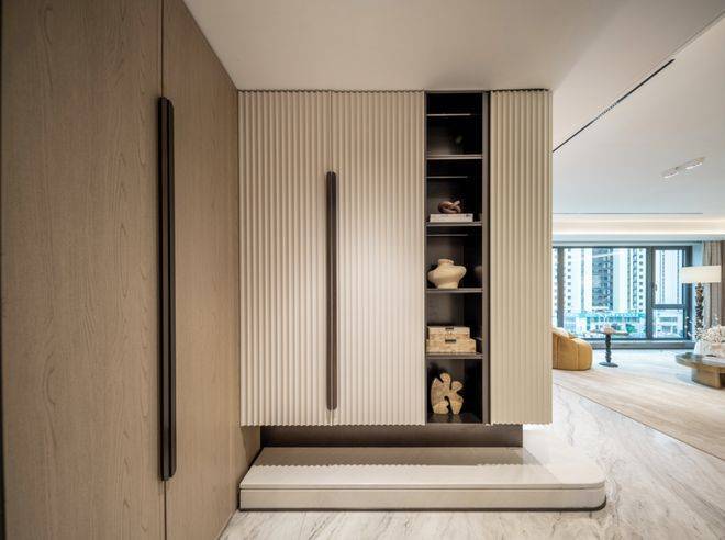 它同样延续两梯两户的私密配置,推门即是独立玄关,还额外规划了800库深舱仓储系统——日常的换季衣物、行李箱、清洁工具等都能妥善收纳,让居家环境始终整洁,生活从容感直接拉满。