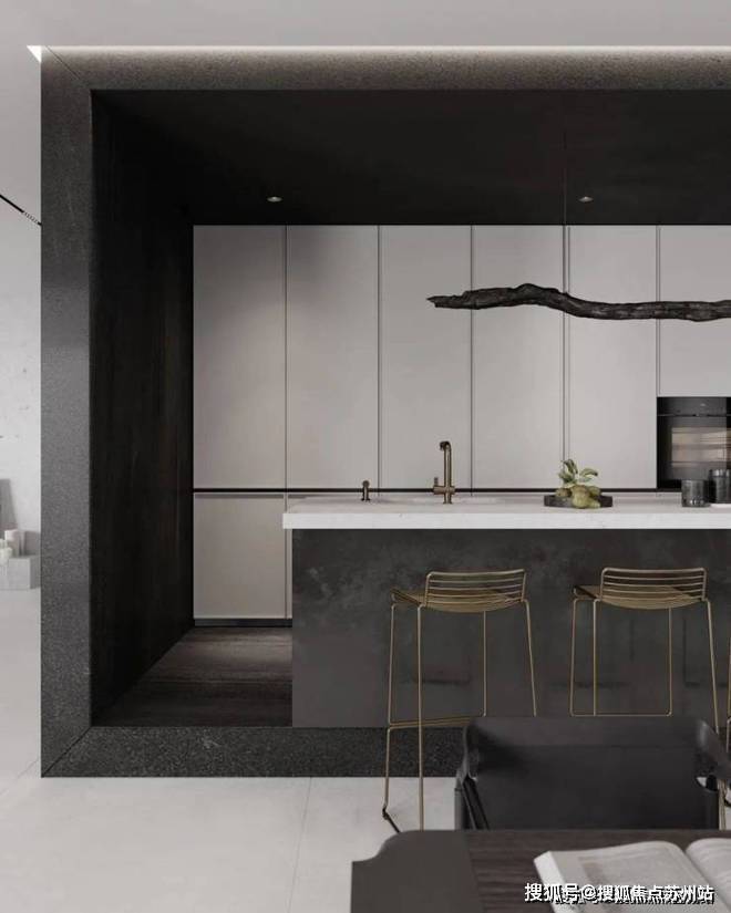 The design of the kitchen is like a work of art and a high-end restaurant. Simple line with a little industrial style design. The open kitchen and the integrated pattern add a visual extension effect.