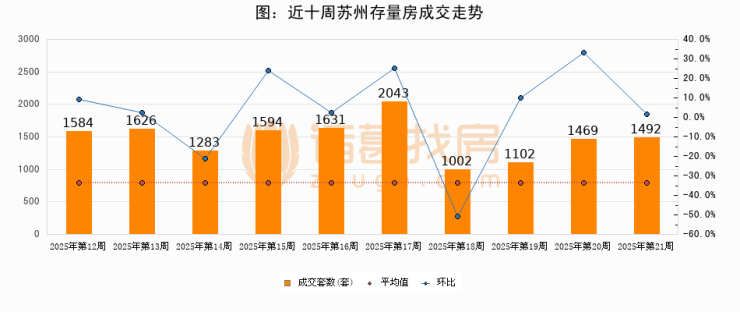 存量房方面,第21周苏州存量房成交1492套,较上周增加23套,环比上涨1.6%。从近十周成交走势来看,周均成交套数为1482套,本周高于平均水平0.7%。