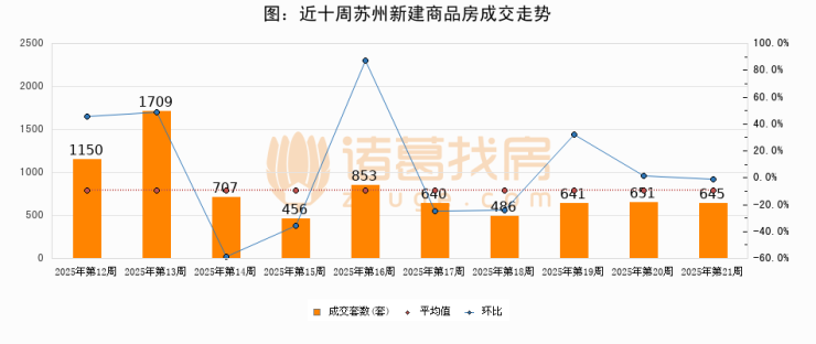 进入2025年第21周(05月19日-05月25日),苏州新建商品房成交645套,较上周减少6套,环比下降0.9%