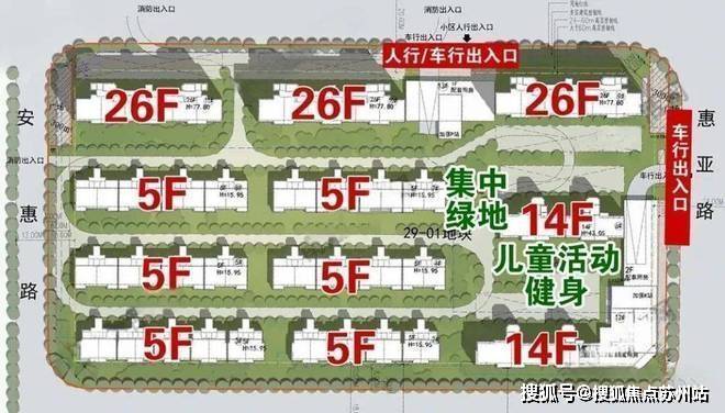 根据公示图显示,该项目的4个小板块最高层为项目东南角和西北角的26层高层,共有6栋,高度接近地块限高的80米(77.80米);18层的共有8栋;17层共有6栋;14层共有4栋;13层共有2栋;6层的共有4栋;5层的共有8栋。