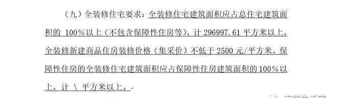 同时明确:外立面方面明确“金属部分应采用铝板、紫铜等防锈防腐金属材料”等。而内部装修规定则更加明晰:“厨房应采用橱柜、厨电一体化设计,应配置燃气灶、油烟机等,厨电卫生间应设置防水,吊顶应配置浴缸或钢化玻璃淋浴房,配置淋浴龙头和座便器,台盆柜采用石材台面,配洗面盆和水龙头,室内装修须包含地暖、空调、新风系统”