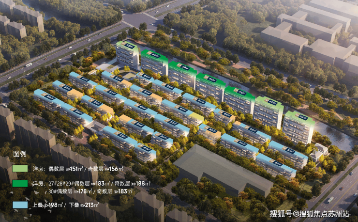 洋房产品有A户型和B户型,A户型偶数层建面约151㎡,奇数层建面约156㎡;B户型在30#楼,偶数层建面约178㎡,奇数层建面约183㎡。叠加别墅产品包括上叠建面约198㎡和下叠建面约213㎡。