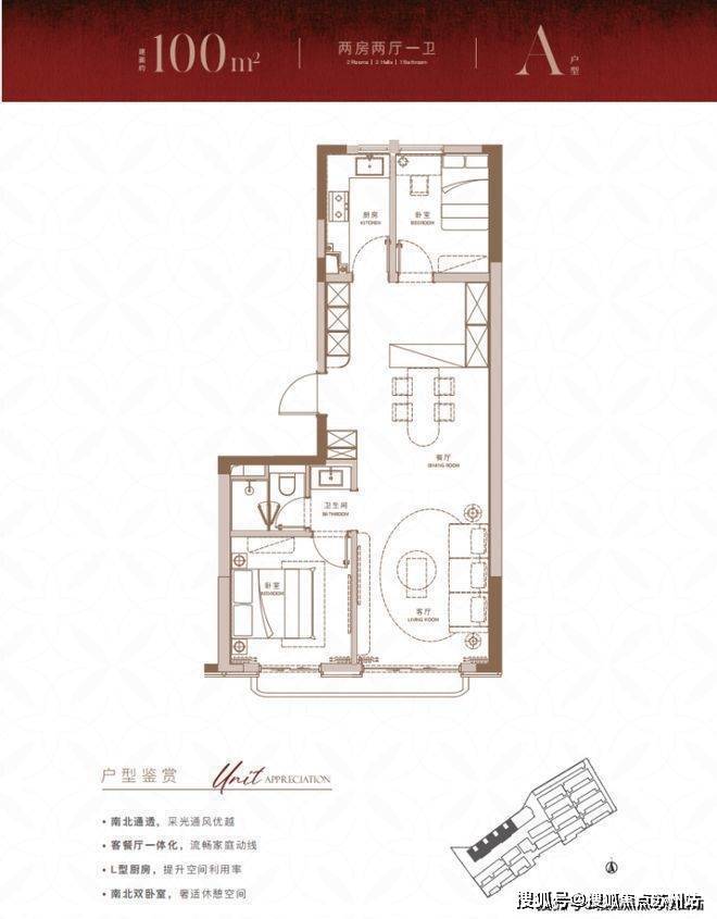 建面约100㎡2房2厅1卫户型