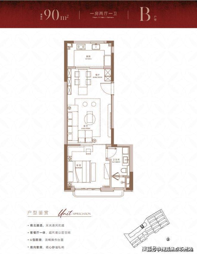 建面约90㎡1房2厅1卫户型