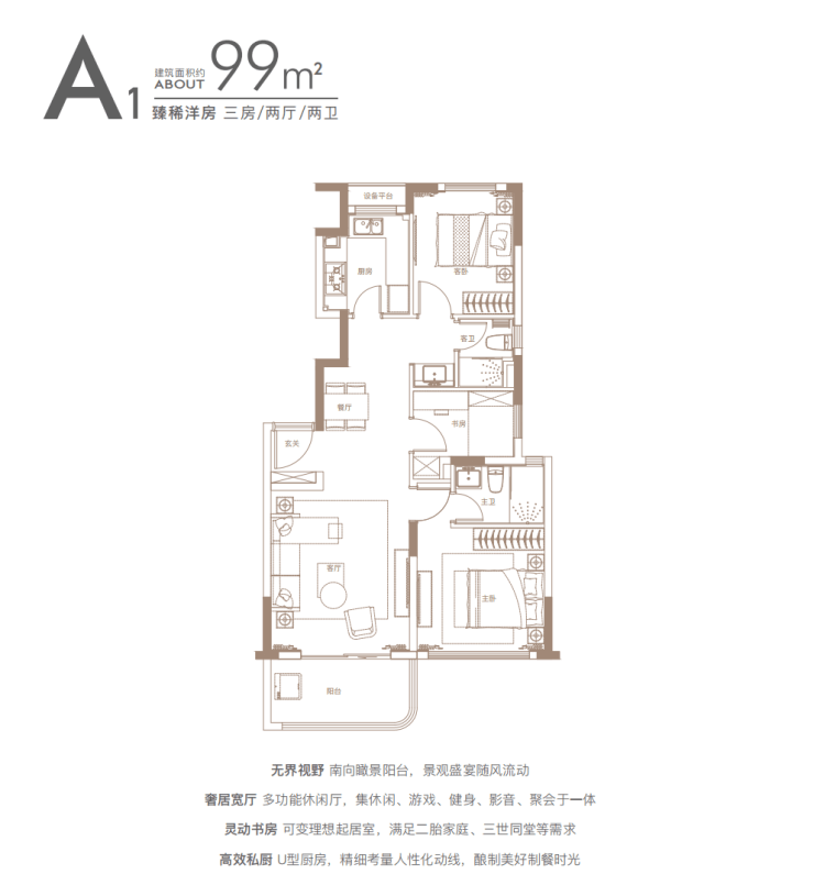 独立玄关、U型厨房、主卧大套间、三开间朝南大面宽等均为标配,堪称140㎡段的“完美四房”。