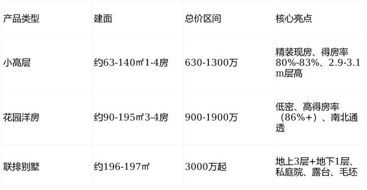 交付/装修:现房/准现房(2025年3月已交付,2026年在售为现房);小高层/洋房精装交付(大金中央空调、威能地暖、霍尼韦尔新风,西门子/科勒等);联排毛坯交付。