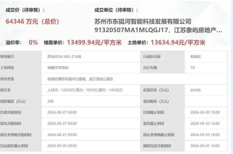 虎丘江南里,即苏地2024-WG-Z14号地块,位于相城区黄桥街道华元路南、虎丘湿地公园东,城镇住宅用地,2024年9月由黄桥国资&象屿底价竞得,成交总价64346万元,成交楼面价13500元/平。