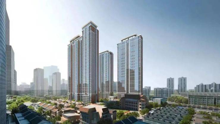高层建筑立面风格上,以世贸金麻与香槟色、铜色交错。建筑底部采用石材,整体大面积采用全铝板打造,以金属独有的高级质感,通过立面线条的有序交织,呈现传统与创新交替辉映的独特建筑语言。