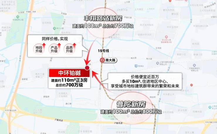而一旦买到中环铂樾,你将享受到的地段是:距离南大路站直线约300米真地铁房,上车后1站8万+桃浦、5站11万+真如、7站约14万+内环。