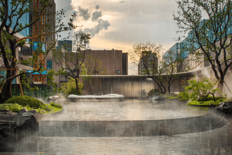 浮光池院水院会客厅,现已实景呈现,水景中央的艺术小品,如一滴水在湖面晕开,泛起阵阵涟漪。