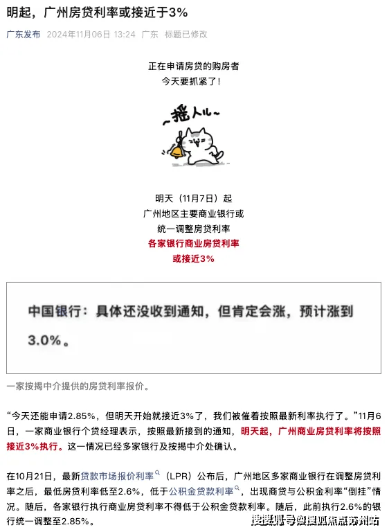 2024年底广州部分区域商业银行最低房贷利率低至2.6%,曾出现商贷与公积金贷款利率“倒挂”情况。为此2024年11月6日,广东省人民政府新闻办公室官方微信“广东发布”发文曾表示:多家银行及按揭中介确认,自11月7日起广州地区主要商业银行或统一调整房贷利率,各家银行商业房贷利率最低不得低于3%。