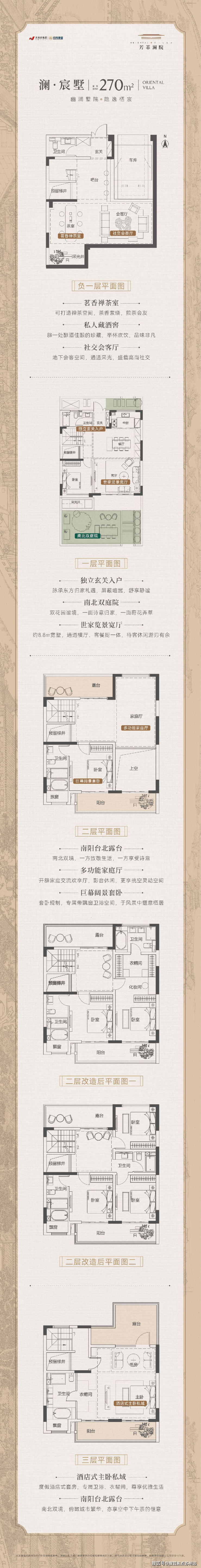 产品设计上,芳菲澜院是一个纯联排别墅和少量洋房社区,容积率低至1.0,属于纯低密住宅社区,居住舒适度非常高。联排别墅产品面积为约270平及300平,边户为300平,中户为270平,每户都有专属电梯,采用全明卫设计,而且赠送面积很多,如一层挑空、二层北露台、三层南北露台等,实际得房率相当高。