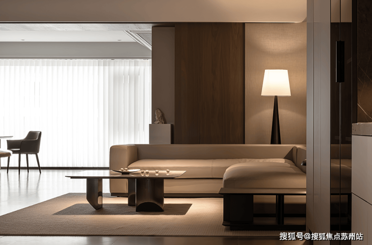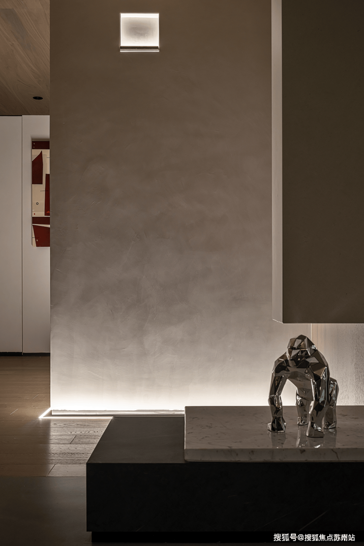 色彩过渡自然清晰,借由光线巧妙强化踢脚线,清晰梳理客餐厅与过道间的内在逻辑关联。转折的体块设计融入镂空元素,与素雅温润质感相呼应,共同谱写出诗意的空间韵律。
