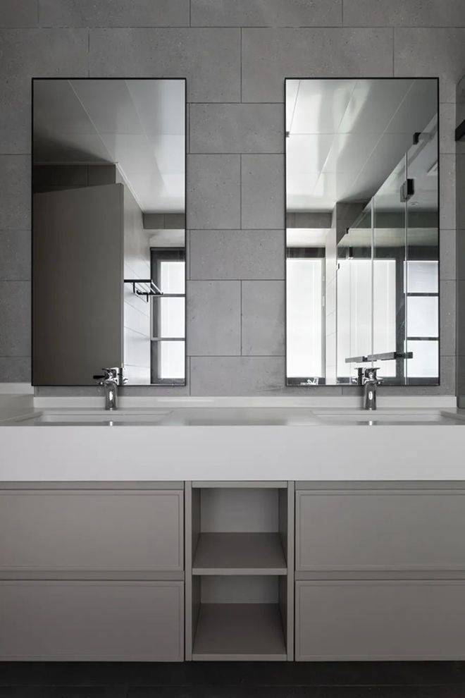 双人位的洗手盆,灰色的墙面空间,结合灰色洗手盆柜,两个洗手盆之间的台面下加入开放格架,也带来了一个灵活的卫浴收纳。