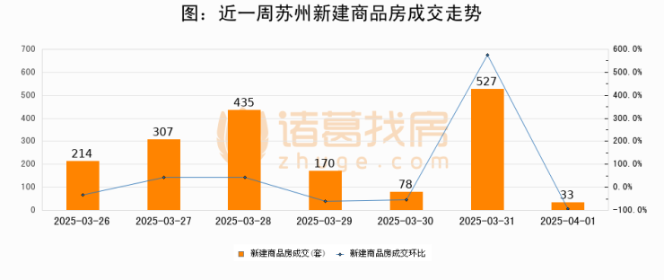 根据苏州市房地产市场和交易管理中心数据显示,2025年04月01日苏州新建商品房成交33套,较昨日减少494套,环比下降93.7%。近一周苏州新建商品房日均成交252套。04月01日单日成交33套,低于近一周平均水平86.9%。
