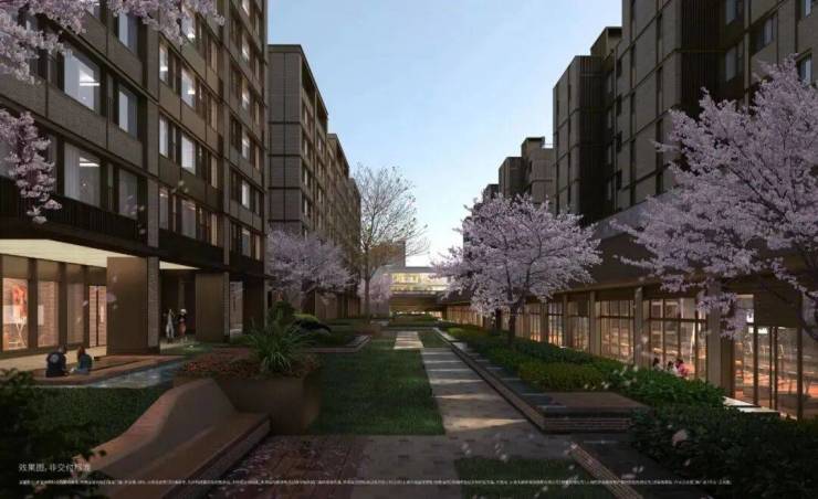 融合式架空庭院,通过借景的手法,将住宅与樱花谷景观相衔接,增加邻里互动空间,重现海派里弄的温馨场景。