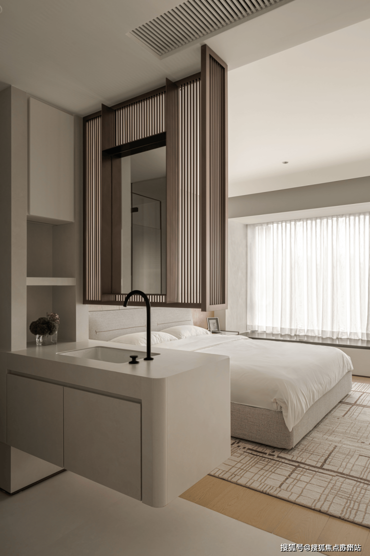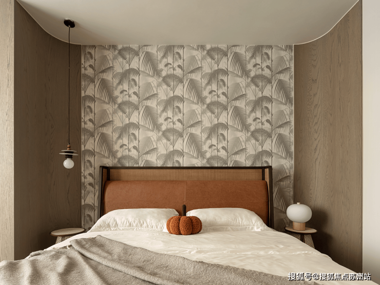 设计师为床体打造了“凹槽”,展现了家的安稳性,同时赋予了墙面细腻的叶片,来点缀空间的自然之意,让生活的意境更具浪漫的成分。